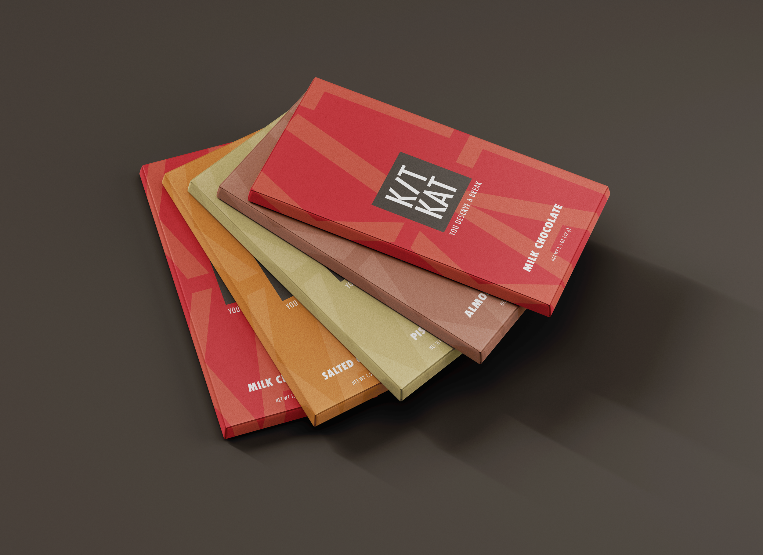 I leaned into Kit Kat’s core brand colors for instant recognition but stripped back the design to focus on minimal, clean elements that feel contemporary and premium. To expand the concept, I introduced two new flavors, demonstrating how the updated system could adapt to new product lines while staying cohesive.